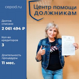 Списано долгов на 1,2 млн. р. за 13 месяцев. Кол-во кредиторов - 3 шт.